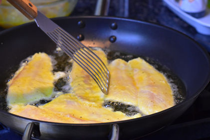 Sole fish fillets dipped in a light egg batter and pan-fried, usually served with a lemon-butter sauce, showcasing a blend of Italian and French culinary traditions.