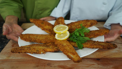 Sole fish fillets that are breaded and fried, presenting a dish that's crispy on the outside and delicate inside.